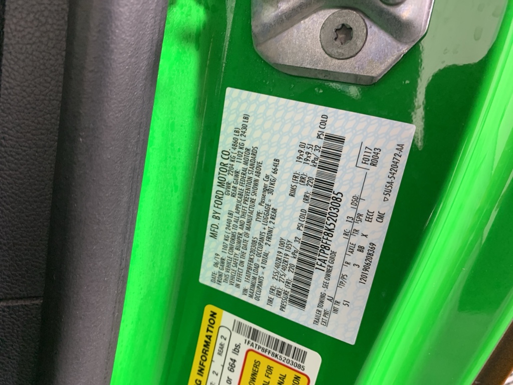 Equipment Group 401A: 18" X 8" Machined-Face Aluminum Wheels; Blind Spot Info System with Cross-Traffic Alert; Leather Bucket Seats with Color Accents; 5.0L Ti-VCT V8 Engine; 6-Speed Manual Transmission; 235/50ZR18 BSW AS Tires; Memory Driver Seat. Mirrors and Ambient Lighting. Premium Plus Package: 12" LCD Digital Instrument Cluster with MyColor; Voice-Activated Touch-Screen Navigation System; Heated Steering Wheel; FordPass Connect. GT Performance Package: Engine Spun Aluminum Instrument Panel; Heavy Duty Front Springs; Spoiler Delete; Unique Stability Control; 3.73 TORSEN Limited-Slip Rear Axle Ratio; Larger Radiator; Larger Brake Rotors; Gauge Pack (oil Pressure and Vacuum). Premier Trim with Color Accent Group: Linked Graphite Aluminum Instrument Panel; Premium Floor Mats with Accent Stitch. B&O Sound System by Bang and Olufsen. Active Valve Performance Exhaust. Voice-Activated Touch-Screen Navigation System. **Equipment listed is based on original vehicle build and subject to change. Please confirm the accuracy of the included equipment by calling the dealer prior to purchase.**