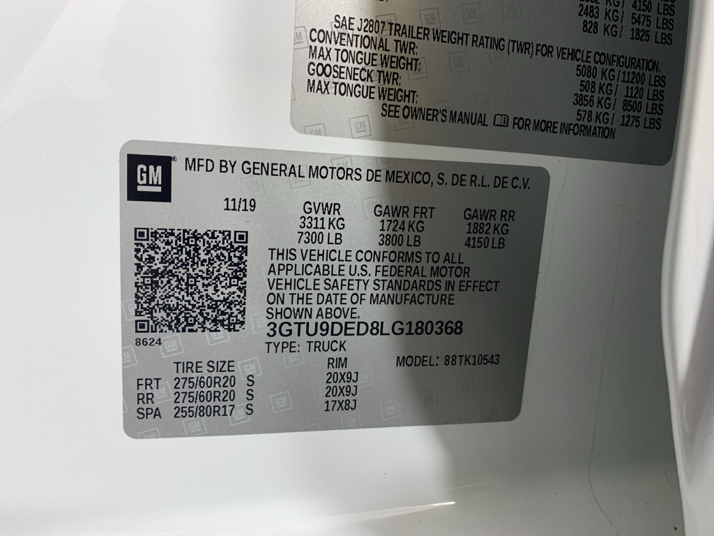 SLT Convenience Package: Ventilated Driver and Front Passenger Seats; Heated 2nd Row Outboard Seats; Power Sliding Rear Window with Rear Defogger; 2 USB Ports (1st Row); Floor-Mounted Center Console; Front Bucket Seats; 2 USB Ports; Universal Home Remote. Driver Alert Package I: Ultrasonic Front and Rear Park Assist; Rear Cross Traffic Alert; Perimeter Lighting; Lane Change Alert with Side Blind Zone Alert. Driver Alert Package II: Forward Collision Alert; Lane Keep Assist with Lane Departure Warning; Front Pedestrian Braking; Following Distance Indicator; Automatic Emergency Braking; Safety Alert Seat; IntelliBeam Automatic High Beam On/off; Adaptive Cruise Control - Camera. Max Trailering Package: Increased RGAWR; Enhanced Cooling Radiator; 220 Amp Alternator; 3.42 Rear Axle Ratio; Heavier Duty Rear Springs; 7. 300 lbs (3. 311 Kgs) GVWR. SLT Preferred Package: Premium Bose 7-Speaker Sound System; Wireless Charging; Premium GMC Infotainment System Radio with Navigation. SLT Premium Plus Package: 20" X 9" Polished Aluminum Wheels; Chrome Wheel to Wheel Assist Steps; Spray-On Pickup Bed Liner with GMC Logo. Preferred Equipment Group 4SA: LED Cargo Area Lighting; Hitch Guidance; Remote Vehicle Starter System; Electric Rear-Window Defogger; 5.3L EcoTec3 V8 Engine; Theft Deterrent System (unauthorized Entry); Chrome Grille; 170 Amp Alternator; Auxiliary External Transmission Oil Cooler; Compass; Electrical Lock Control Steering Column; Trailering Package; 120-Volt Instrument Panel Power Outlet; Heated Driver and Front Outboard Passenger Seating; Steering Wheel Audio Controls; GMC Connected Access Capable; Color-Keyed Carpeting Floor Covering; OnStar and GMC Connected Services Capable; Power Front Passenger Windows with Express Up/down; Deep-Tinted Glass; Power Rear Windows with Express Down; HD Radio; Integrated Trailer Brake Controller; Single Speed Transfer Case; Power Front Windows with Driver Express Up/down; Manual Tilt-Wheel and Telescoping Steering Column; Rear Dual USB Charging-Only Ports; Front Frame-Mounted Black Recovery Hooks; Keyless Open and Start; 4G LTE Wi-Fi Hotspot Capable; ProGrade Trailering System; Rear Wheelhouse Liners; 12-Volt Rear Auxiliary Power Outlet; Heavy-Duty Rear Locking Differential; Power Door Locks. GMC Protection Package: Front and Rear Black Molded Splash Guards; All-Weather Floor Liner. 20" X 9" Polished Aluminum Wheels. Chrome Wheel to Wheel Assist Steps. Spray-On Pickup Bed Liner with GMC Logo. All-Weather Floor Liner. 275/60R20SL AT BW Tires. Front and Rear Black Molded Splash Guards. **Equipment listed is based on original vehicle build and subject to change. Please confirm the accuracy of the included equipment by calling the dealer prior to purchase.**